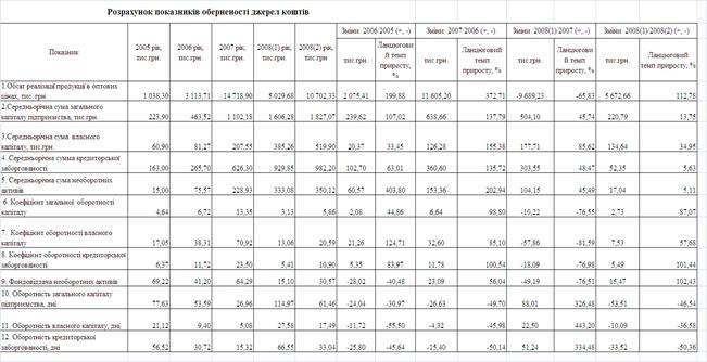 Аналіз динаміки оборотності джерел коштів підприємства ТОВ «Металоіндустрія Плюс» за 2005 2008 роки