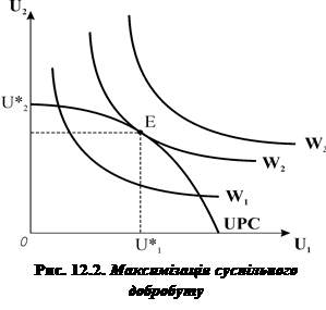 Максимізація функції суспільного добробуту у відповідній графічній моделі (рис. 12.2) передбачає суміщення кривих рівного добробуту або суспільних кривих байдужості