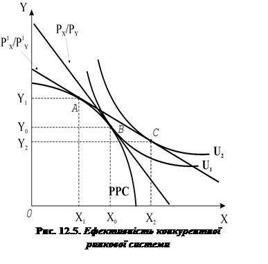 (рис. 12.5) ілюструє оптимізацію структури виробництва згідно суспільних потреб за допомогою межі виробничих можливостей та кривих суспільної байдужості. Рівновага встановлюється у точці дотику кривої суспільної байдужості до межі виробничих можливостей