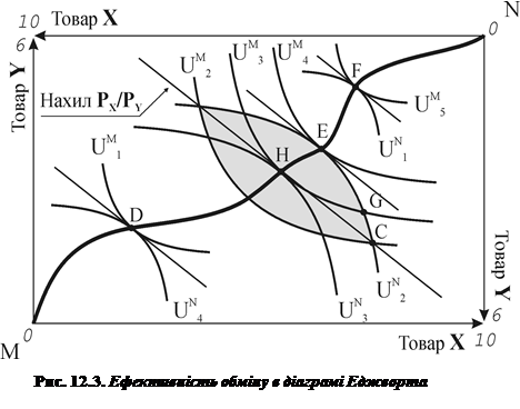 (рис. 12.3). Вона представляє всі можливі варіанти розподілу двох благ між двома споживачами . Рівновага