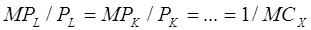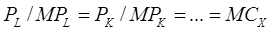 Правило оптимального співвідношення ресурсів включає в себе також правило граничного випуску, за яким конкурентні фірми визначають оптимальний обсяг виробництва для максимізації прибутку: . Якщо запишемо правило мінімізації витрат ресурсів як обернену величину, то отримаємо граничні витрати на виробництво даного продукту. Для галузі, яка виробляє товар : , звідси . А оскільки , то кожна фірма буде мати граничні витрати, рівні ринковій ціні даного товару .