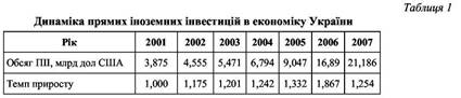 , на перший погляд, виглядає доволі обнадійливою: динаміка, наприклад, прямих іноземних інвестицій в економіку країни демонструє сприятливі для розвитку тенденції (табл. 1). Звичайно, внутрішні інвестиції виглядають набагато привабливішими, оскільки експансія іноземного капіталу може викликати певні проблеми, пов'язані з негативними структурними змінами в економіці, вичерпуванням місцевих ресурсів, деструктивними впливами на соціальне середовище тощо. Спроможність же до акумулювання інвестиційних ресурсів на рівні країни в цілому та, зокрема, в регіонах є значно нижчою, ніж у більш розвинених державах. Відтак, іноземні інвестиції слід вважати тим ресурсом, який сьогодні може істотно сприяти підвищенню ефективності функціонування української економіки, регіональному розвитку, підвищенню соціального захисту громадян.