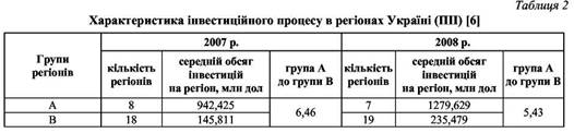 З таблиці видно, що близько третини регіонів країни (група А) отримували за період 2007-2008 рр. значно більше ПІІ ніж регіони групи В. При цьому, певне скорочення у 2008 р. відношення середнього обсягу ПІІ на регіон по групі А та Bважко вважати суттєвим фактором покращення ситуації. У даний період значно зросла частка м. Києва у обсягах інвестицій. Відповідно скоротилася участь інших регіонів у інвестиційному процесі.