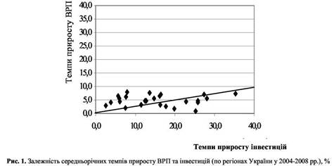 Для аналізу ефективності регіональних інвестицій використовувалися дані щодо темпів приросту ВРП та темпів приросту інвестицій по регіонах за період 2004-2008 рр. [6]. Результати порівняння показано на рис. 1.