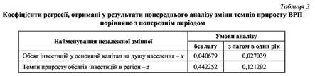 Дані табл. 3 вказують на деякі ознаки прямого зв'язку у залежності темпів приросту ВРП від темпів приросту обсягів інвестицій в регіон (без лагу R= 0,442). Це може підтверджувати гіпотезу про переважання короткострокових інвестицій, ефект яких проявляється у межах одного року. Втім, як показує аналіз, параметри такої залежності не є статистично значимими.