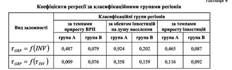 Звичайно, середній показник еластичності дозволяє зробити припущення про характерінвестиційних процесів та їх вплив на економіку регіонів, однак він, є надто загальним. Для поглиблення дослідження використовувалися групування й аналіз регресії. Розглядалися наступні дані за період 2004-2008 рр.: темпи приросту ВРП порівняно з попереднім періодом (Y — залежна змінна моделі); обсяг інвестицій у основний капітал на душу населення по регіонах, грн (x); темпи приросту обсягів інвестицій в регіон (z).