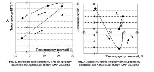 У Харківській області, оскільки інвестиції досягли порогу чутливості, спостерігається цілком природна залежність темпів приросту ВРП від темпів приросту інвестицій. Так у зоні А ВРП зростає як наслідок інвестування, та у зоні В — скорочується при зменшенні темпів приросту інвестицій. До речі, як Харківська областьвходить за зробленими рейтинговими оцінками до групи інвестиційно привабливих регіонів, так і Херсонська область є представником регіонів низької інвестиційної привабливості [21].