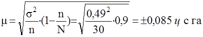 Отбор участков в примере производится по схеме бесповторной выборки. Из 300 участков было отобрано 30, т.е. доля участков, попавших в выборочную совокупность составляла = =0,1 или 10%. Дополнительный множитель =1,0-0,1=0,9.