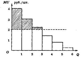 Как мы уже знаем, покупатель приобретает товар определенного вида в таком количестве, что предельная полезность последней покупаемой единицы, выраженная в денежной форме, равна цене товара. Но предельная полезность каждой предшествующей единицы больше, чем последующей (закон Госсена), а цена у всех единиц одинакова. Таким образом, полезность каждой единицы покупки, за исключением последней, больше той цены, которую покупатель за нее платит, и в целом, произведя покупку, оказывается в выигрыше.