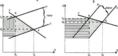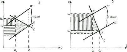 Рассмотрим теперь зависимость распределения налогового бремени от эластичности предложения. Эта ситуация отражена на рис. 11 для случаев до и после введения налога. Обратимся опять к выделенным четырехугольникам. При эластичном предложении (рис. 11а) налоговое бремя ложится в основном на потребителя, рост цены и сокращение объема производства будут значительными, сумма налога будет относительно меньше, чем при неэластичном предложении, потери общества выше. При неэластичном предложении (рис. 11, б) наблюдается обратная картина: основное налоговое бремя несет товаропроизводитель.