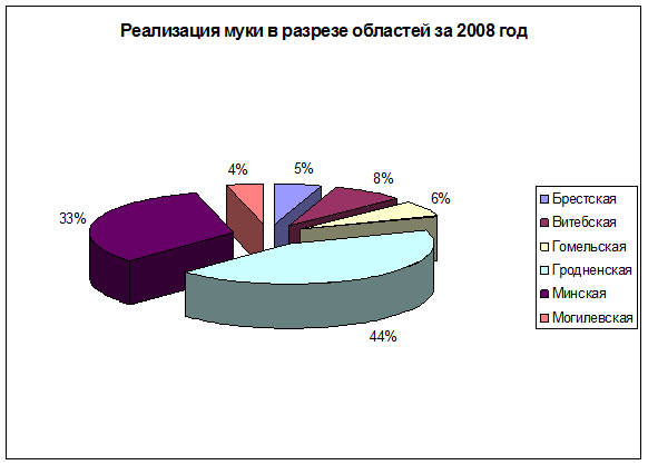 Рисунок 5 – Реализация муки в разрезе областей за 2008 г