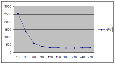 при Е=90 %, NPV =+397,6 у.е. при Е=240 %, NPV = +319,1 у.е.