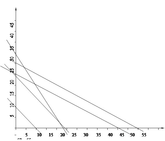 1. Строим область, являющуюся пересечением всех полуплоскостей, уравнения которых приведены в системе ограничений. Например, полуплоскость 2x1+x2<=60;представляет собой совокупность точек, лежащих ниже прямой, соединяющей точки с координатами (0:60) и (30; 0). Аналогично – остальные.