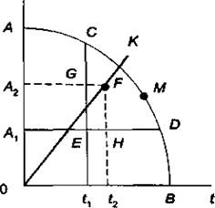 Наконец, точка М соответствует экономическому равновесию (торговые или платежные балансы имеют нулевое сальдо в ценах равновесия). Все другие точки ядра CDсоответствуют вариантам взаимовыгодного, но не эквивалентного обмена. При этом точки кривой CD, лежащие правее М, более предпочтительны для региона 1 (в частности, это соответствует отрицательному сальдо вывоза-ввоза товаров для региона 1 и положительному сальдо для региона 2). Точки, лежащие левее М, более предпочтительны для региона 2 (знаки сальдо вывоза-ввоза продукции меняются на противоположные). Заметим, что в точке К, являющейся пересечением луча OFс границей Парето, соотношение целевых показателей f1