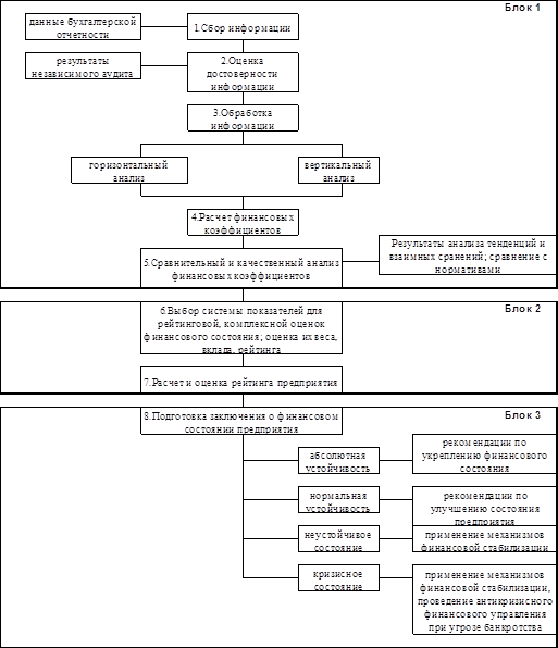 На рис. 1 представлен алгоритм проведения комплексного экономического анализа состояния предприятия. Блок 1 указанной схемы представляет собой традиционный финансовый анализ.
