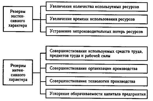 В экономической литературе под резервами часто понимается снижение потерь в использовании ресурсов. Правильнее под резервами понимать неиспользованные возможности снижения текущих и авансируемых затрат материальных, трудовых и финансовых ресурсов при данном уровне развития производственных сил и производственных отношений. Устранение всякого рода потерь и нерациональных затрат – это один путь использования резервов. Другой путь связан с большими возможностями ускорения научно-технического прогресса как главного рычага повышения интенсификации и эффективности производства. Таким образом, резервы в полном объеме можно измерить разрывом между достигнутым уровнем использования ресурсов и возможным уровнем исходя из накопленного производственного потенциала предприятия.