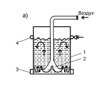 г) газлифтный: 1 – корпус,2 – диффузор, 3 – диспергатор, 4 – воздухораспределитель, 5 – теплообменник,