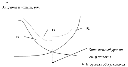 Графически оптимальный размер уровня сервиса можно определить, построив суммарную кривую F3, отражающую поведение затрат и потерь в зависимости от изменения уровня обслуживания. График функции F3 получен суммированием функций F1 и F2.