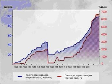 Всего в Российской Федерации к началу 1999 г. функционировали 34 национальных парка, суммарная официально установленная площадь которых составляла 6784,6 тыс. га, а к началу 2000 г. – 35 парков общей площадью 6956 тыс. га (Рис. 10).
