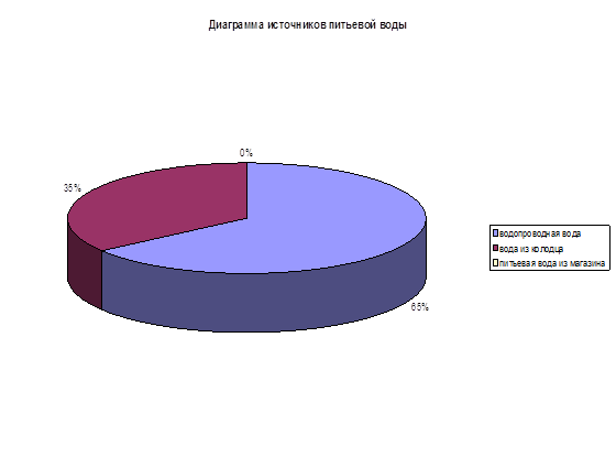Большинство опрошенных (65%) используют дома водопроводную воду, воду из колодца – 35 %, питьевую воду в магазине никто из родителей опрошенных учеников не покупает (приложение 4).