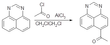 Известно, что пиримидин относится к так называемым π-амфотерным системам, т.е. обладает одновременно свойствами ярко π-избыточных и π-дефицитных соединений. Поэтому, пиримидин и его производные способны вступать как в реакции нуклеофильного, так и в реакции электрофильного замещения. C другой стороны, имеются данные о биологической активности различных производных перимидина. Некоторые производные являются депрессантами и эффективными стимуляторами центральной нервной системы. 2-Аминоперимидины обладают противомикробнойактивностью, а 2-ациламиноперимидины – фунгицидным действием. Таким образом, продолжение изучения реакционной способности пиримидина и синтез новых функциональных производных этого гетероцикла является весьма перспективным и полезным направлением. Практическая часть курсовой работы состояла в получении 7(6)ацетил пиримидина, являющемся ценным реагентом для органического синтеза. На первой стадии синтеза для получения чистого пиримидина важную роль играет предварительная перегонка 1-8нафталиндиамина, так как перимидин плохо поддается перекристаллизации. Был получен пиримидин, пригодный для дальнейшего использования. Выход составил 99% от теоретического. Вторая стадия - ацилирование по Фриделю-Крафтсу важно не допустить попадания в реакционную смесь даже следов воды, для этого применялась хлоркальциевая трубка. Выход ацетил пиримидина составил 60% или 0,756г . потери связанны с частичной растворимостью соединения в воде.
