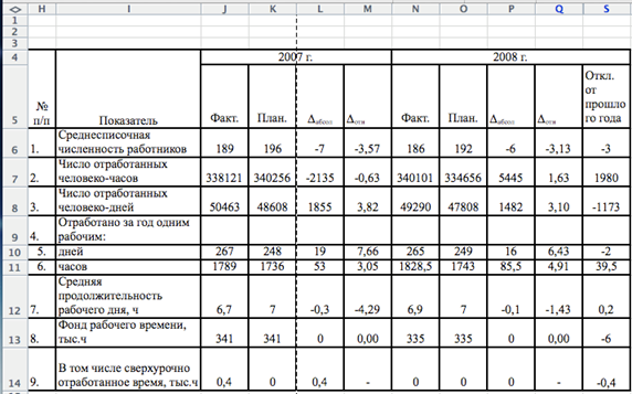 Использование рабочего времени анализируется путем сопоставления отчетных данных с плановыми показателями. Анализ начинается с общей оценки использования рабочего времени. Объектом анализа является величина отклонения фактически отработанного времени в человеко-часах в отчетном периоде от соответствующего показателя за предыдущий период или планового показателя.