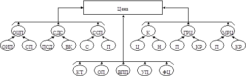 Рисунок 1. Система ценообразующих факторов ОЦП - общественная цена производства; ОИП - общественные издержки производства; СП - средняя прибыль; СДС - состояние денежной сферы; ПСД - покупательная способность денег; ВК - движение валютных курсов; ССП - соотношение спроса и предложения; С - спрос; П - предложение; К - конкуренция; Ц - ценовая; Н - неценовая; ГРЦ - государственное регулирование цен; П - прямое (административное) регулирование; КР - косвенное (экономическое) регулирование; КТ - качество товара; ОП - объем поставок; ВПП - взаимоотношение между продавцом и покупателем; УП - условия поставок; ФЦ - франкирование цен.