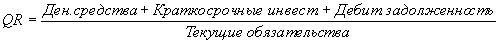Рассчитывается по данным баланса фирмы как частное от деления суммы денежных средств, краткосрочных инвестиций и дебеторской задолженности на на текущие обязательства. Характеризует способность компании отвечать по своим текущим обязательствам с использованием наиболее ликвидных (обращаемых в деньги) активов.