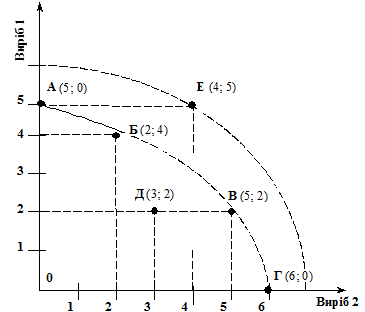 З таблиці видно, що збільшення виготовлення виробу 2 зменшує виготовлення виробу 1 і навпаки. Крива АБВГ, яку називають кривою виробничих можливостей (рис. 1), показує альтернативні варіанти за повного використання ресурсів. Усі точки, які містяться всередині фігури 0АГ, означають неповне використання ресурсів (наприклад, точка Д — одночасне виготовлення двох виробів 1 і трьох виробів 2). І навпаки, будь-яка виробнича програма, точки якої розміщуються за межами фігури 0АГ, не буде забезпечена тими ресурсами, які має підприємство (наприклад, точка Е — одночасне виготовлення п’яти виробів 1 і чотирьох виробів 2). Крива виробничих можливостей має випуклу форму. Це означає, що кожне збільшення виготовлення, наприклад, виробу 1 на одиницю потребує дедалі більше ресурсів, які використовують для виготовлення виробу 2.