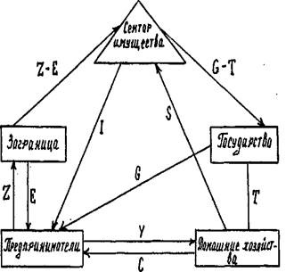Представленная модель состоит из двух типов рынков и двух групп участников взаимосвязей. Население и предприниматели общаются друг с другом, передавая деньги в обмен на товары и услуги, на рынке товаров и рынке ресурсов (факторов производства). Денежный поток включает в себя доходы и расходы субъектов рынка, а следовательно, и изменение объема их имущества, в которое входят производительный капитал (машины, оборудование и т.д.), земля, жилые дома, ценные бумаги, лицензии и патенты и др. Денежная оценка имущества представляет собой дисконтированную сумму ценности ожидаемых от него доходов.