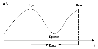 Цикл представляет собой интервал времени в развитии рыночной экономики, в течение которого происходит увеличение объема производства товаров и услуг, а затем сокращение, спад, депрессия, оживление и, наконец, снова его рост (рис. 1).