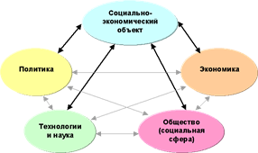 В этой системе есть детерминирующие связи, направленные с нижних уровней иерархии системы к верхним (наука и технология влияет на экономику, экономика влияет на политику), а также обратные и межуровневые связи. Изменение любого из факторов через эту систему связей может влиять на все остальные.