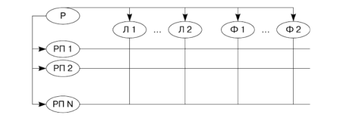 Рис. 8. Матричная структура управления: Р руководитель организации; РП руководитель проекта; Л линейный руководитель; Ф функциональный руководитель