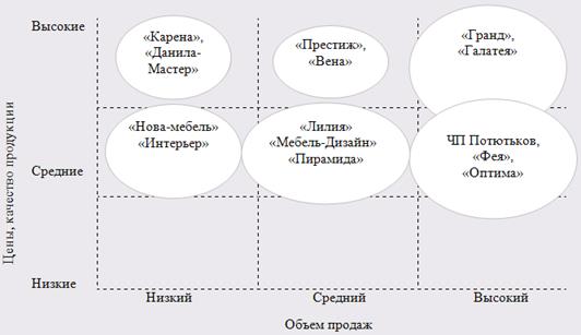 В настоящее время мебельная промышленность РФ находится в стадии интенсивного развития. В период 2000-2008г. объем производства мебели на территории России увеличился в 4 раза. Ежегодные темпы роста в тот же период составили порядка 22%, а в отдельных регионах достигли и 40% в год. Дальнейшее развитие мебельной отрасли регионов во многом будет зависеть от действий, предпринимаемых местными властями в поддержку регионального производителя, и самих компаний, понимающих тенденции рынка и развивающих перспективные направления производства и сбыта собственной продукции. В стратегическую группу исследуемого объекта (ЗАО "Лилия") входят также "Мебель-Дизайн" и "Пирамида" - организации, имеющие не самый большой и не самый маленький объем реализации продукции и реализующие продукцию по средним ценам. В целом, мебельная отрасль находится в стадии зрелости. Это влечет за собой необходимость совершенствовать методы менеджмента. Все фирмы поддерживают средний уровень цен и конкурируют по таким параметрам как реклама, обслуживание, качество продукции, дополнительные услуги и т.п. В мебельной отрасли конкуренцию нельзя назвать жесткой, так как спрос на мебельную продукцию растет быстрыми темпами [2]. Вместе с тем методы дополнительно стимулирования покупателей быстро копируются конкурентами, и приходится прилагать немало усилий для сохранения положения в отрасли. Оценив положение анализируемого предприятия и конкурентов, мы выявили сильные (достоверный мониторинг рынка, отлаженная сбытовая сеть, широкий ассортимент продукции, высокий контроль качества, высокая рентабельность, рост оборотных средств, высокая квалификация персонала, хорошая мотивация персонала, достаточная известность) и слабые (сбои в снабжении, недостатки в рекламной политике, средний уровень цен, низкий уровень сервиса (дополнительные услуги), не полная загруженность производственных мощностей, неучастие персонала в принятии управленческих решений, недостаточный контроль исполнения приказов и распоряжений) стороны анализируемого предприятия.