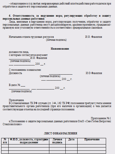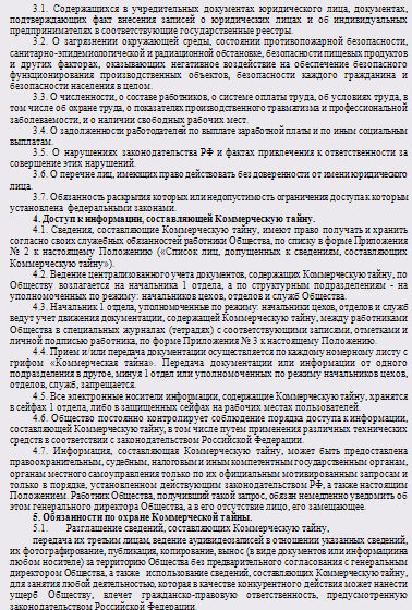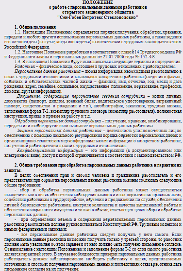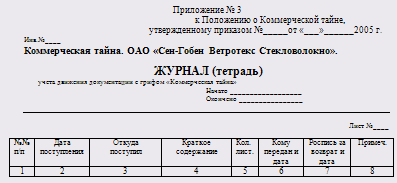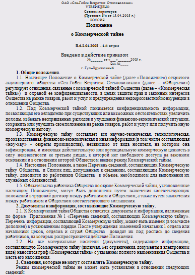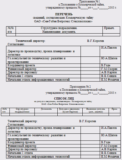 В ОАО "Сен-Гобен Ветротекс Стекловолокно" действует Положение о коммерческой тайне (см. Приложение А), которое регулирует отношения, связанные с коммерческой тайной Общества и охраной ее конфиденциальности. В данном документе есть три приложения.