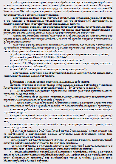 7.3. Споры и разногласия, которые могут возникнуть при исполнении условий настоящего трудового договора, стороны могут решить по взаимному согласию. При недостижении взаимоприемлемого решения спор может быть передан для разрешения его в порядке, предусмотренном трудовым законодательством РФ, в суд. Защита персональных данных работников в Организации устанавливается в Положении о работе с персональными данными работников открытого акционерного общества "Сен-Гобен Ветротекс Стекловолокно" (см. Приложение С).