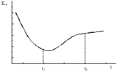 1. Проявление высокой нестационарности процесса конденсации на начальных стадиях осаждения (на стадии образования островковой пленки). Коэффициент конденсации атомов металла на поверхность полимера сложным образом зависит от времени осаждения (рисунок 13).