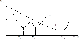 2. Сложный характер влияния температуры полимерной подложки на коэффициент конденсации (рисунок 7.14). В общем случае температурная зависимость Кк является немонотонной и зависит от природы полимера.
