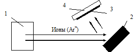 Рисунок 2 – Схема ионно-лучевого распыления: 1–источник ионов; 2–распыляемая мишень; 3–покрытие; 4 – подложка