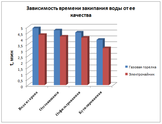 В ходе выполнения исследования было установлено, что дольше всего закипает вода из крана, т.е. она является водой самого плохого качества в нашем исследовании. Быстрее всего как в электрочайнике, так и на газовой горелке закипает бутилированная вода, т.е. она является самой качественной водой.