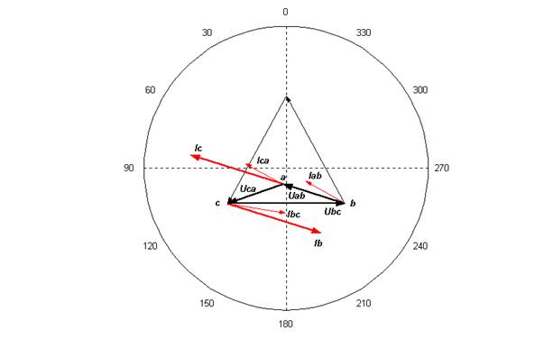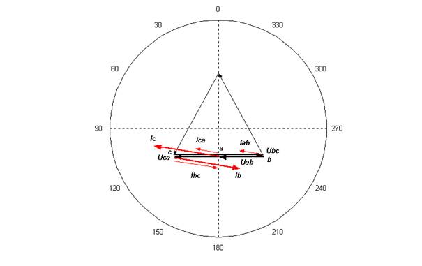 Соединение звезда \ треугольник, симметричная нагрузка, обрыв фазы «а-в»: