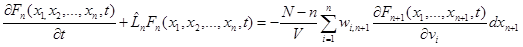 Эта система в зарубежной литературе называется обычно ББКГИ-системой (Борн, Боголюбов, Кирквуд, Грин, Ивон). Мы будем в дальнейшем для краткости, а также потому, что Боголюбову принадлежит наиболее детальный ее анализ, называть ее системой уравнений Боголюбова. в формуле (7) есть оператор Лиувилля для подсистемы из п частиц. Система уравнений Боголюбова является «зацепляющейся», так как уравнения для функции Fn содержат в правой части функцию Fn+1. Физически это отражает факт незамкнутости любой группы из n молекул (n<N), взаимодействующих с остальными N — n молекулами. Оператор Лиувилля, как видно из (7), однозначно определяет временную эволюцию функции Fn(х1, ..., хп, t) для замкнутой системы частиц, в то время как правая часть (7) описывает ее незамкнутость.