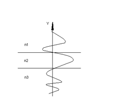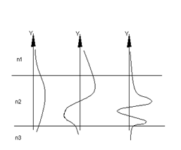 Помітимо, що умови безперервності H- на границях еквівалентна умовам безперервності похідних від розподілу E- поля на границях шарів 1 і 2, 2 і 3. Нехай у розглянутій системі із трьох шарів виконується необхідна умова існування режиму, тобто . Фізично це означає, що хвилі, що біжать у шарі 2 можуть випробовувати повне внутрішнє відбиття від границь із шарами 1 і 3. Для рішення рівнянь розглянемо величину . Якщо величина виявиться негативної, то рішення являє собою експоненту з дійсним показником. Якщо ж ця величина - позитивна, то рішення являє собою гармонійну функцію або експоненту із мнимим показником. Розглянемо властивості рішень: