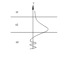 можливе поширення хвилі уздовж шару 2, при цьому розподіл електромагнітного поля в поперечному перерізі має максимальне значення усередині центрального шару 2 (можливе існування декількох максимумів) і експоненциальне спадає при видаленні від границь шару 2 у напрямку осі ОУ (або - ОУ). Хвиля з неоднорідним розподілом по координаті в поширюється уздовж площини хвилеводу й характеризується постійної поширення , при цьому .