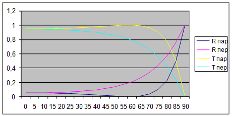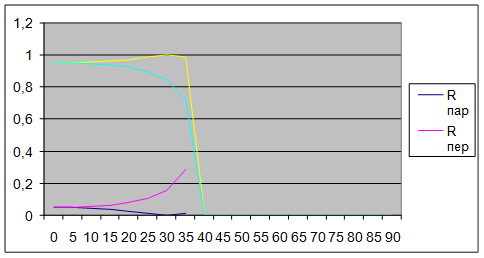 Чітко видний кут Брюстера (62 градуса). Із графіка видно, що відсутній R пара. Електричний вектор відбитої хвилі не має тридцятилітньому в площині падіння.