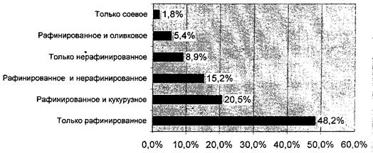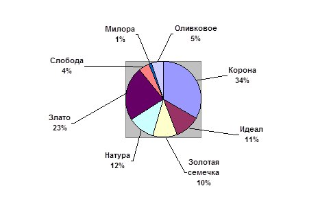 Среди покупателей магазина «Дикси» третья часть предпочитает масло «Корона» (33%), далее идут «Злато» (23%), «Идеал» (11%), «Натура» (10%). Большая часть опрошенных предпочитает делать покупки в крупных торговых сетях, супермаркетах. По видам масла на первом месте рафинированное (38%), далее идет нерафинированное (11%), кукурузное (17%), оливковое (11%), соевое масло пользуется небольшим спросом. Предпочтения в выборе видов масел посетителями магазина соответствуют объемам их производства. Можно сказать, что масло «Корона» пользуется хорошим спросом в таких торговых точках, и здесь возможно увеличение объемов поставок.