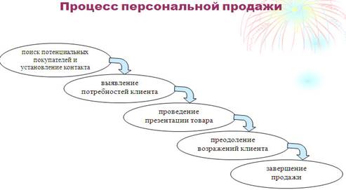Традиционно процесс персональной продажи делят на пять этапов, включающих: поиск потенциальных покупателей и установление контакта; выявление потребностей клиента; проведение презентации товара; преодоление возражений клиента; завершение продажи и послепродажные контакты.