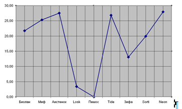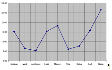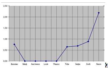 Благодаря нашему исследованию мы определили, например, такие факты: в стиральных порошках Losk, Пемос и Зифа достаточно высокое содержание серы, в концентрированном Неоне содержание серы, фосфора и кремния примерно равны, а так же в этом порошке 10% занимает алюминий. Разрекламированный детский стиральный порошок Аистенок с натуральными активными компонентами по составу схож с обычным стиральным порошком Миф. Существенно выделяются из общей массы такие порошки как Лоск, Пемос и Сорти: Лоск содержит 0,44% меди, Пемос вообще состоит только из серы и кремния, а в составе Сорти есть 0,27% железа.