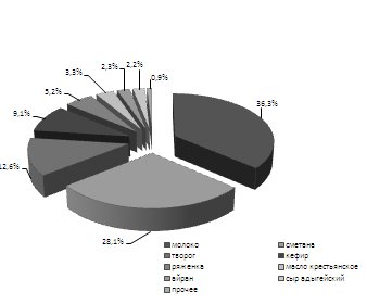 Структура ассортимента свидетельствует о том, что основную долю дохода приносит именно производство и реализация молока. Т.е. предприятие , несмотря на достаточно широкий ассортимент выпускаемой продукции, в основном, реализует молоко (занимается его технологический обработкой и расфасовкой), т.е. предприятие не имеет высокий уровень технологических пределов.