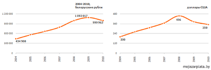 Динамика изменения средней зарплаты в 2004-2010 гг. в белорусских рублях и долларах США